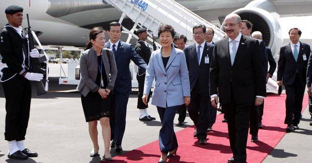 La presidenta de la República de Corea, Park Geun-hye, arribó hoy al Aeropuerto Internacional de la Ciudad de México (AICM), acompañada por una delegación de funcionarios de su país, para realizar una visita oficial.